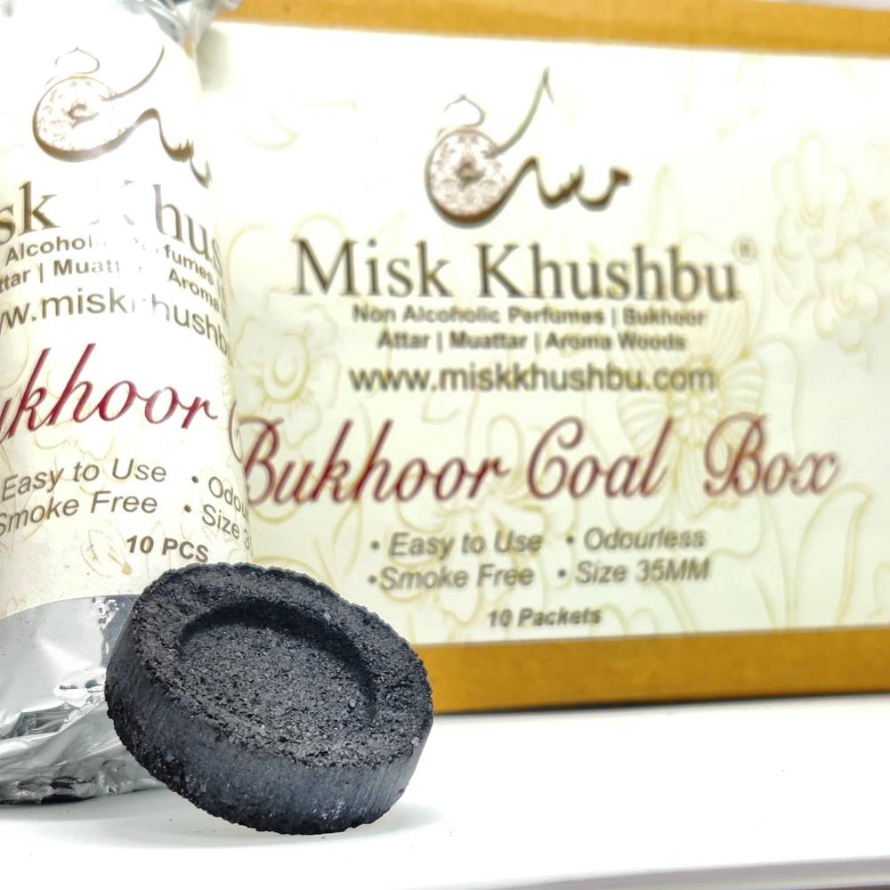 Misk Khushbu Bukhoor Coal to be used for burning bukhoor, muattar, oudh chips & agarwood. Made with pure coal which makes it smoke free & odourless.
